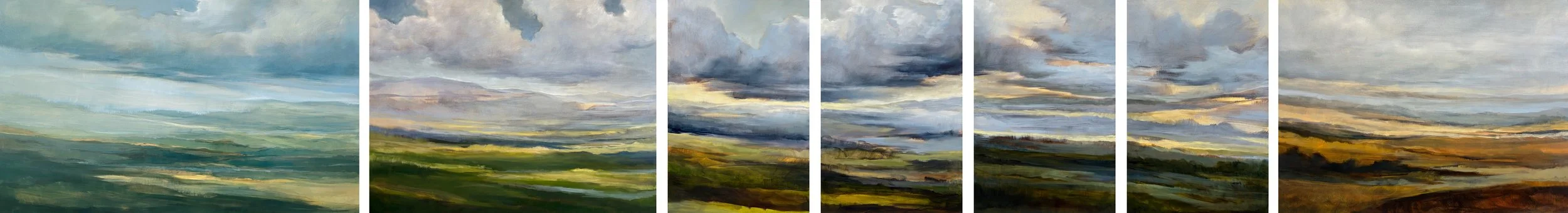 I like to paint in multiples. All my paintings naturally, eventually line up with each other.  In this exhibition I set out to put together a body of work that flows from one piece to the next as one large painting, surrounding the viewer with the endless expanse of landscape.