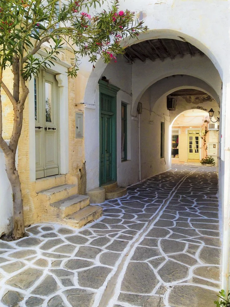 Our retreat is held at the Aegean Center for the Fine Arts — a beautiful, light-filled space tucked into the heart of Parikia. With its neoclassical architecture, creative studios, and warm gathering spaces, it’s the perfect place to slow down, make art, and reconnect with what matters. The Center has welcomed artists and seekers for decades, and you’ll feel the soul of that history as soon as you step inside. It’s not just a location — it’s part of the magic. The town of Parikia is a maze of picturesque winding streets, whitewashed buildings, tiny shops, bakeries, and cafes.